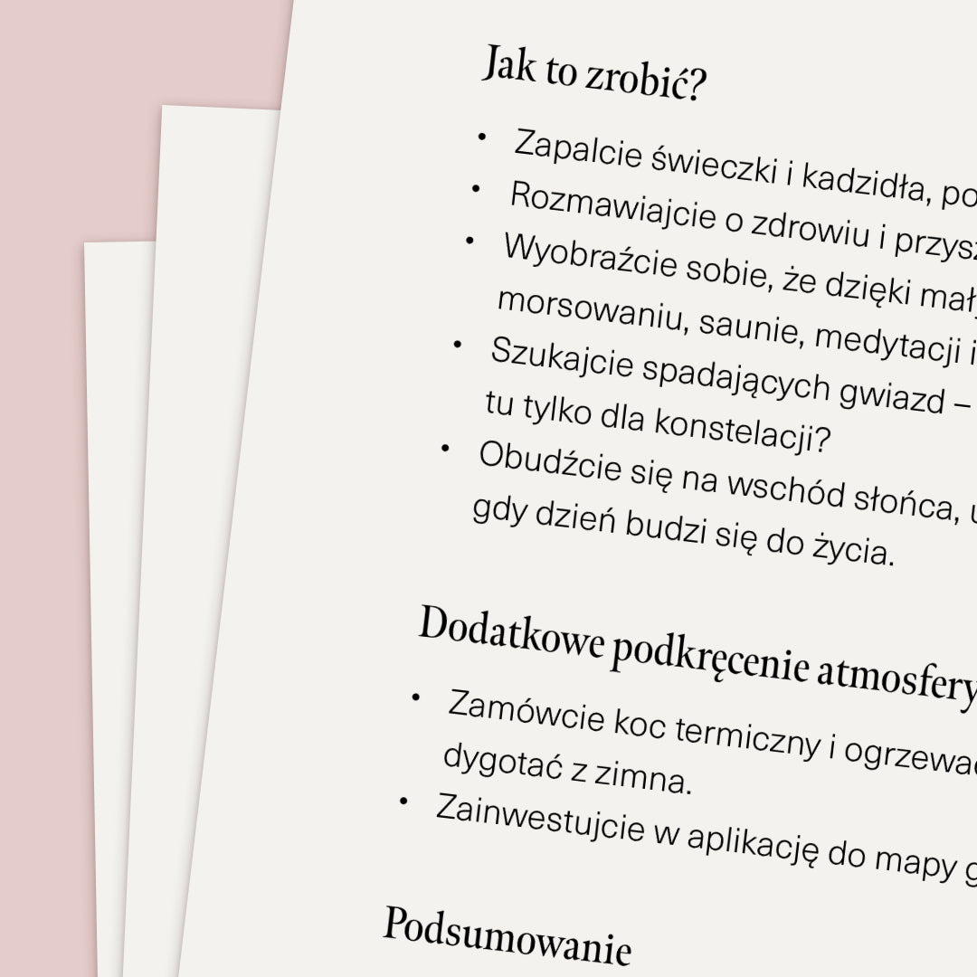 Poziom Bliżej to przewodnik złożony ze 101 zadań, które możecie wybierać, losować lub przechodzić po kolei – w swoim tempie. Każde z nich zawiera jasną instrukcję, czas wykonania, poziom intensywności i pomysły na podkręcenie atmosfery. Wykonacie je w domu, w aucie, na spacerze. W 5 minut lub podczas całego wieczoru.Dla ułatwienia przewodnik podzielony jest na trzy poziomy. Każdy kolejny prowadzi Was głębiej, do większej otwartości, bliskości i odwagi.